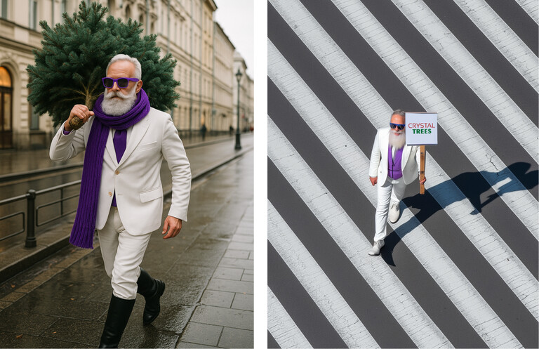 Мы переработали логотип, сохранив узнаваемую типографику и фирменный цвет, сделали знак чище, практичнее и полностью приспособленным к digital-форматам. Разработали цветную и монохромную версии, а также понятный дескриптор. В качестве основного цвета закрепили яркий фиолетовый — решение, которое помогает Crystal Trees резко выделяться на маркетплейсах, где преобладают зелёные, красные и нейтральные карточки. При этом мы сознательно ушли от типично «новогоднего» визуала, чтобы создать современный digital-образ бренда: сочные цвета, динамичные кадры, лёгкий юмор и даже элементы мем-культуры — всё это эффективно работает на привлечение внимания и формирование узнаваемости в онлайне.