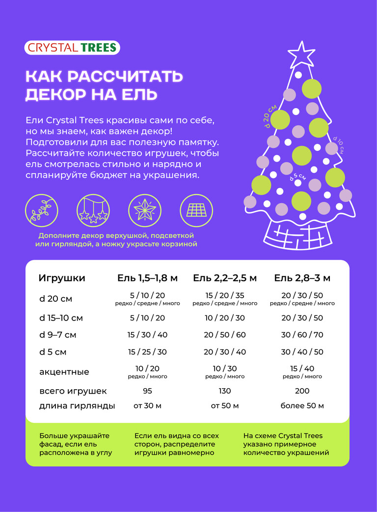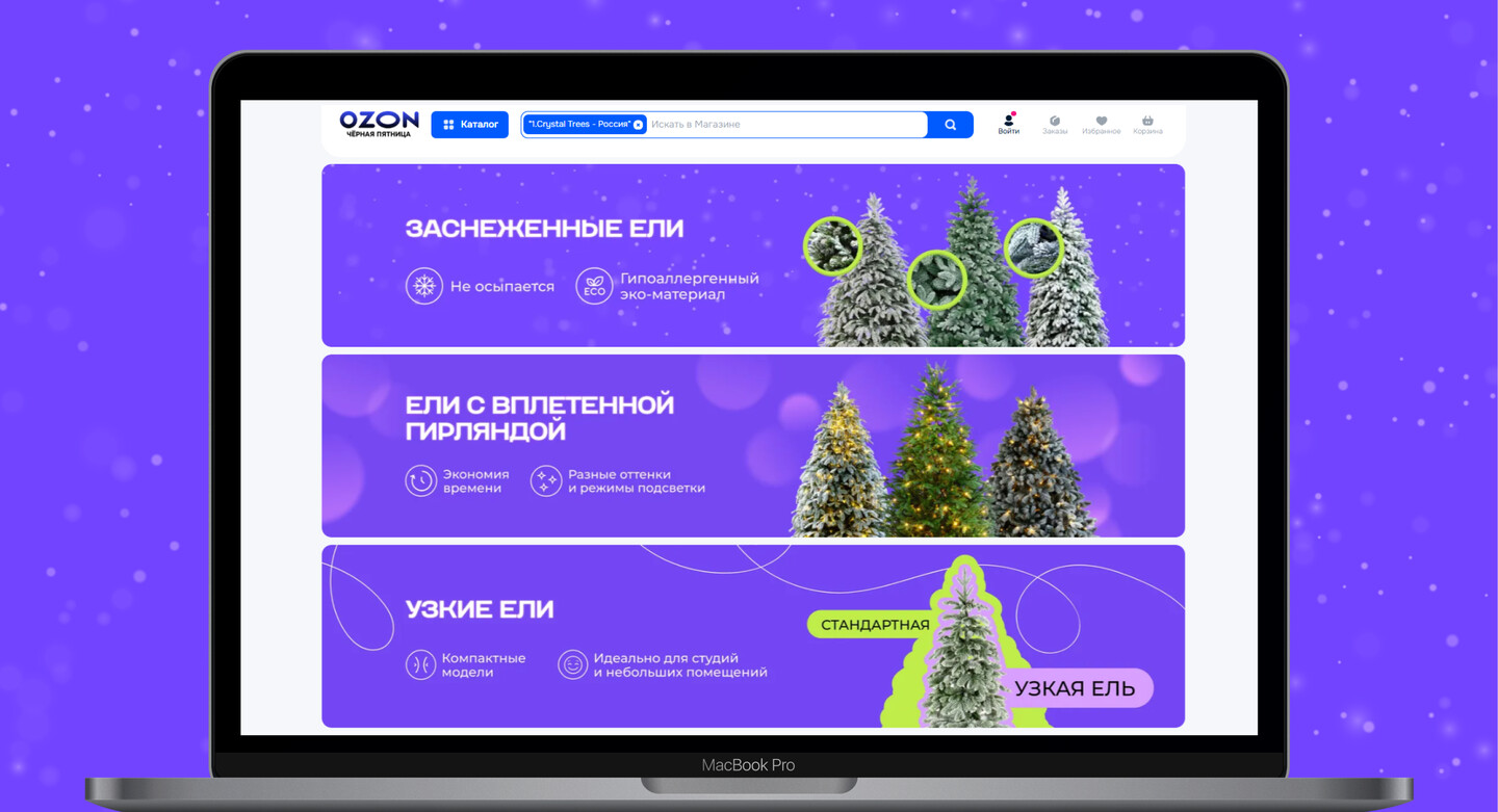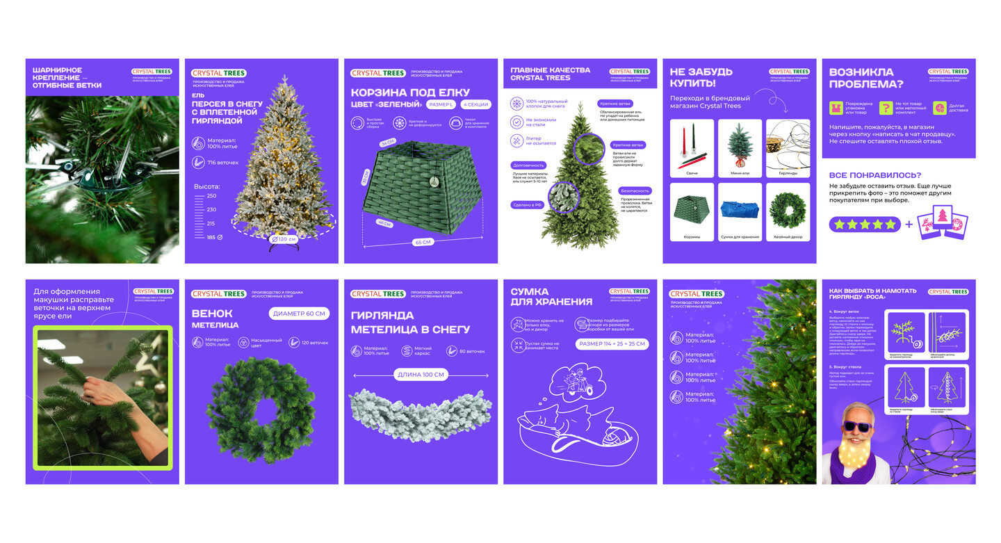 Мы также обновили карточки на маркетплейсах: освежили визуальный язык, адаптировали формат под актуальные требования площадок и создали системные шаблоны, позволяющие легко собирать новые SKU и категории. Помимо этого разработали понятные гайды и схемы — как выбрать и украсить ёлку, чем отличаются модели, что важно при покупке. Такой подход формирует у пользователя привычку к бренду и подчёркивает заботу Crystal Trees о покупателе, что выделяет компанию среди конкурентов.